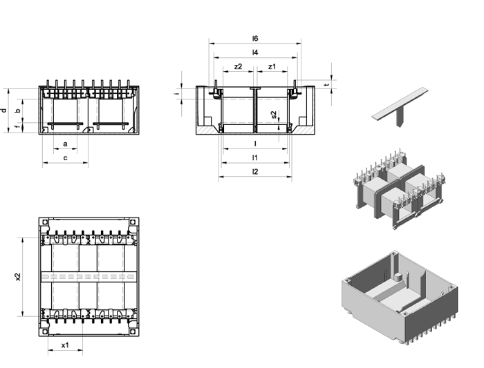 3-teilig, variabel bestückbar mit bis zu 10 eingespritzten Rundstiften (0,8 mm), bestehend aus 2 Spulenkörpern, 1 Vergusshaube mit Trennsteg sowie 1 Isolationsteil im Zwischenflansch eingesetzt
